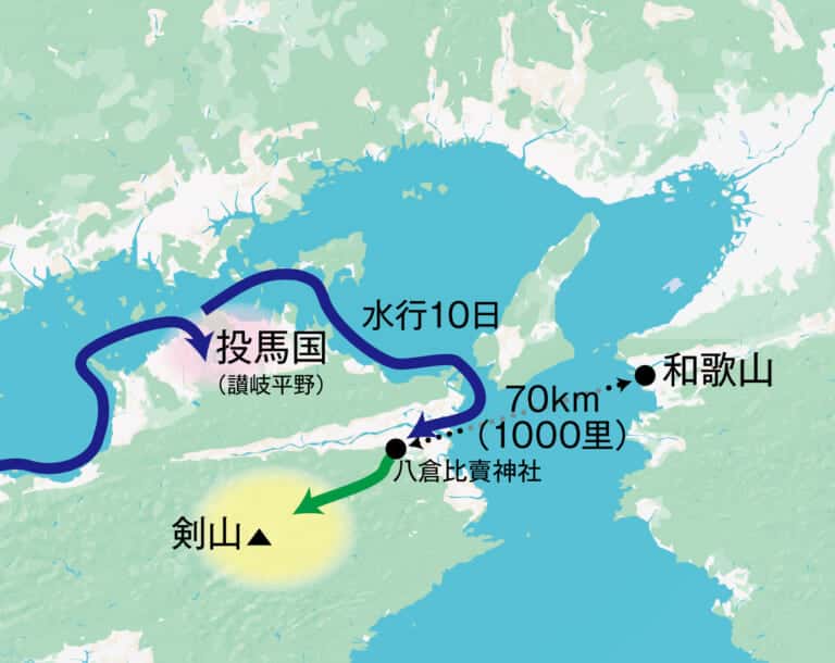 邪馬台国の比定地を、剣山を中心とする徳島の山岳地帯と想定すれば、「魏志倭人伝」に記載されている旅のルートが浮かび上がってきます。旅の方角、距離が合致するだけでなく、渡航ルートが繋がります。まず、朝鮮半島から船で対馬、壱岐を経由して鐘崎・宗像に到達し、その後、九州北部の陸地を東岸まで歩きます。そして再び船に乗って瀬戸内を航海し、投馬国に比定される讃岐平野へ向かい、そこから徳島の東岸、吉野川の河口へと航海し、八倉比賣神社近くで上陸します。その後、30日の陸路を進むと徳島の山岳地帯、最高峰の剣山周辺に至るのです。邪馬台国を徳島の山岳地帯に比定することにより、「魏志倭人伝」に記録された旅の詳細が、朝鮮半島から四国山上まで繋がります。以下が、地図上で確認できる邪馬台国への旅のルートのまとめです。