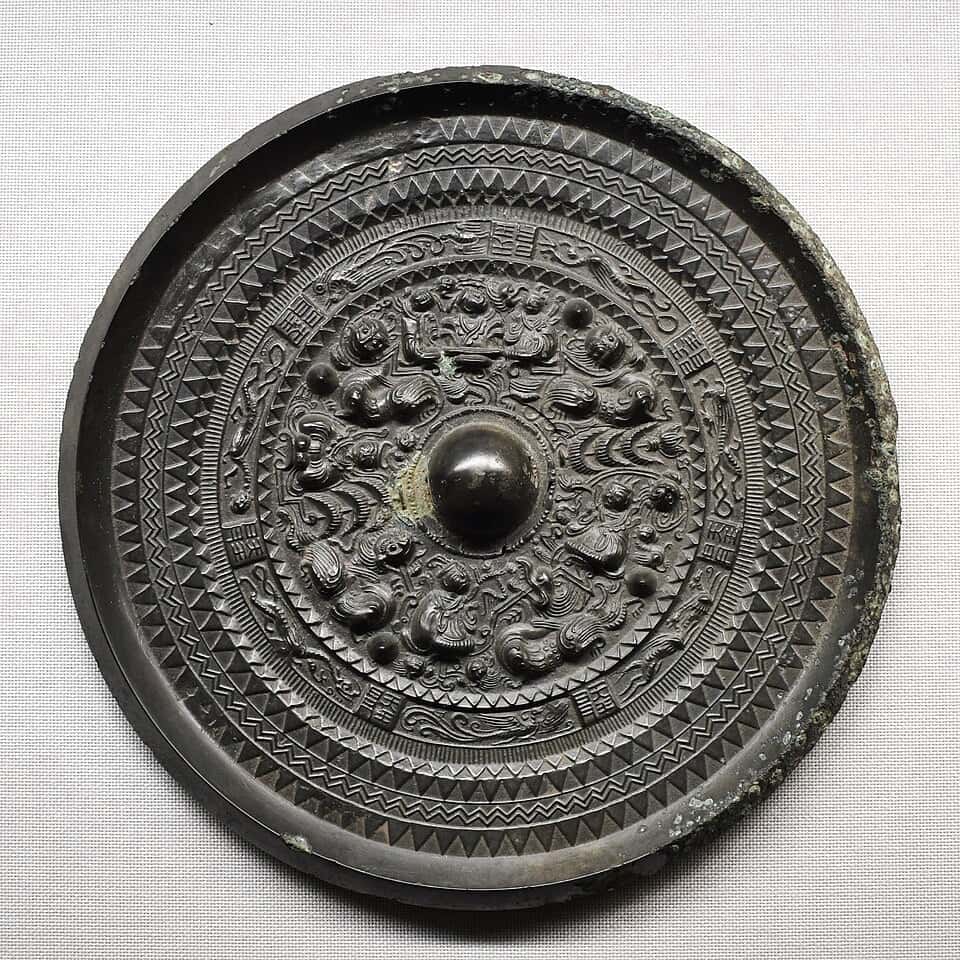 宮谷遺跡から発掘された三角縁神獣鏡(さんかくぶちしんじゅうきょう)は銅鏡の一種として知られています。縁の部分が三角形状の断面であり、鏡の背後には神獣が鋳出されていることから、三角縁神獣鏡と呼ばれています。中国国内では、同等の三角縁神獣鏡は発見されていないため、倭国のために特別に鋳造された可能性が高いようです。